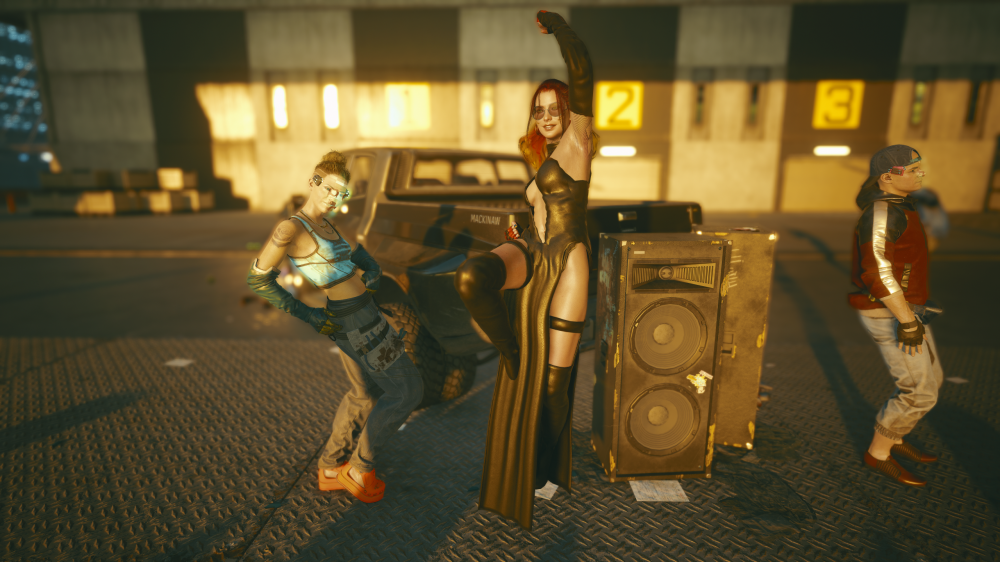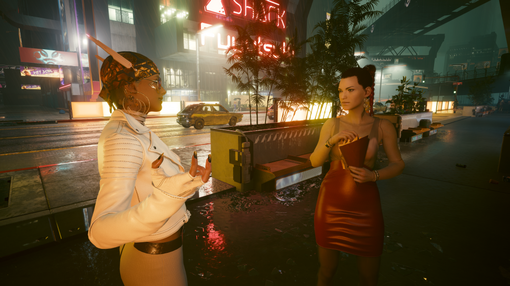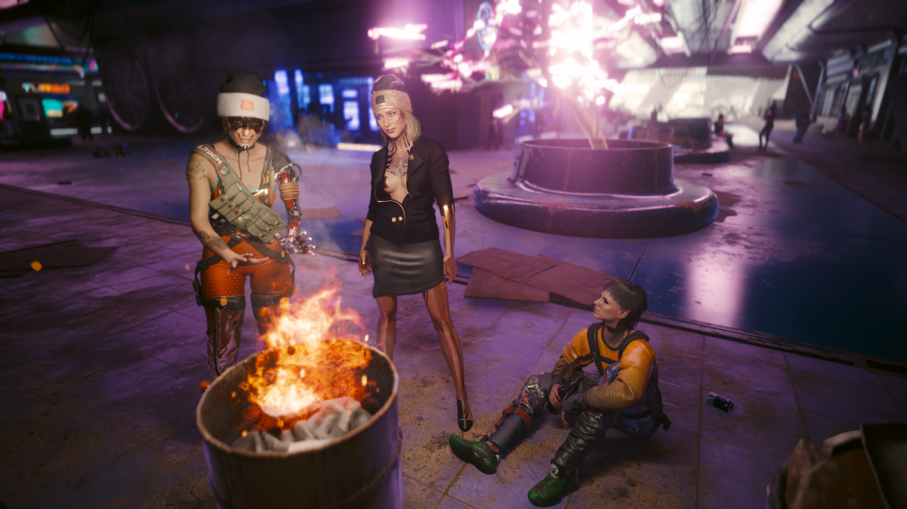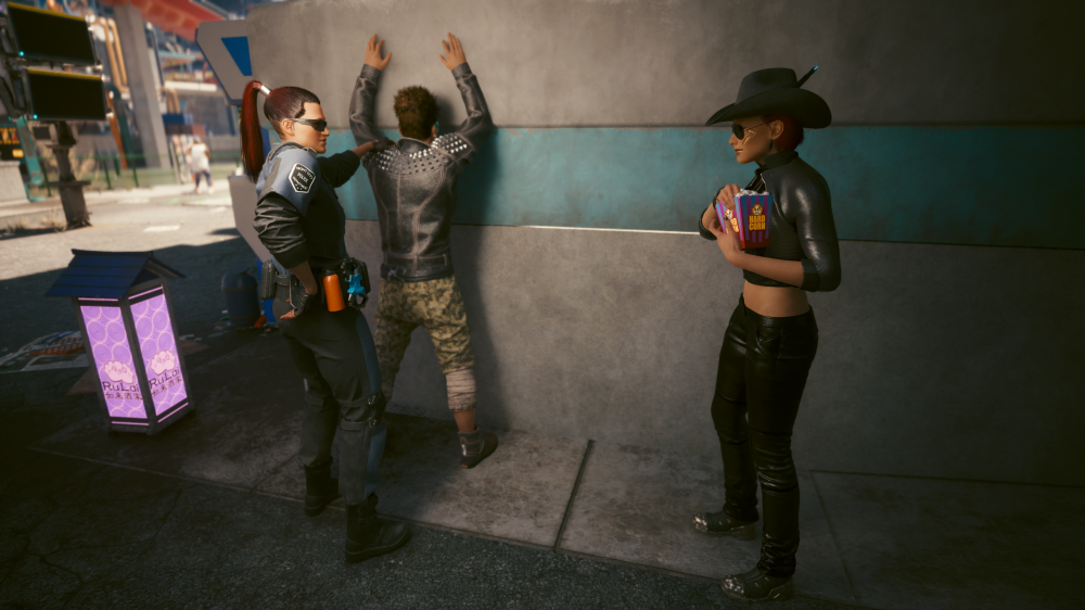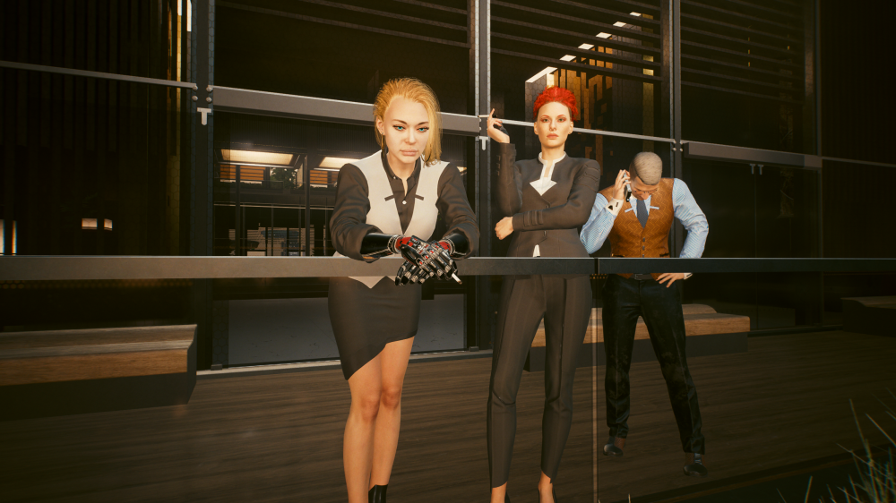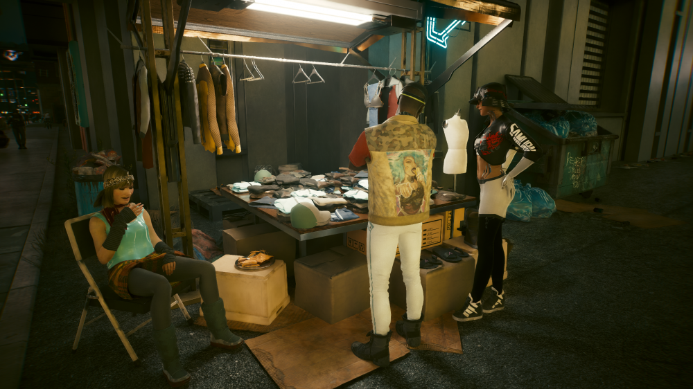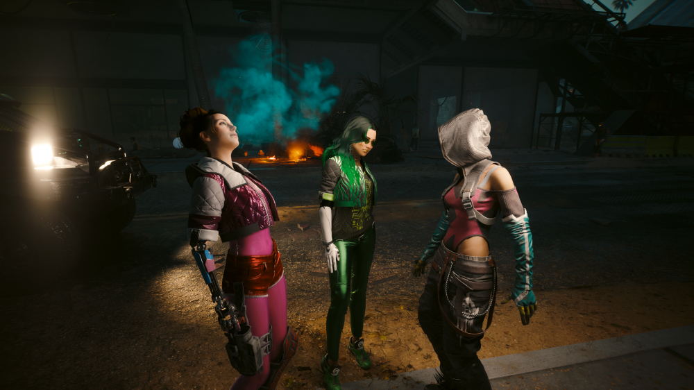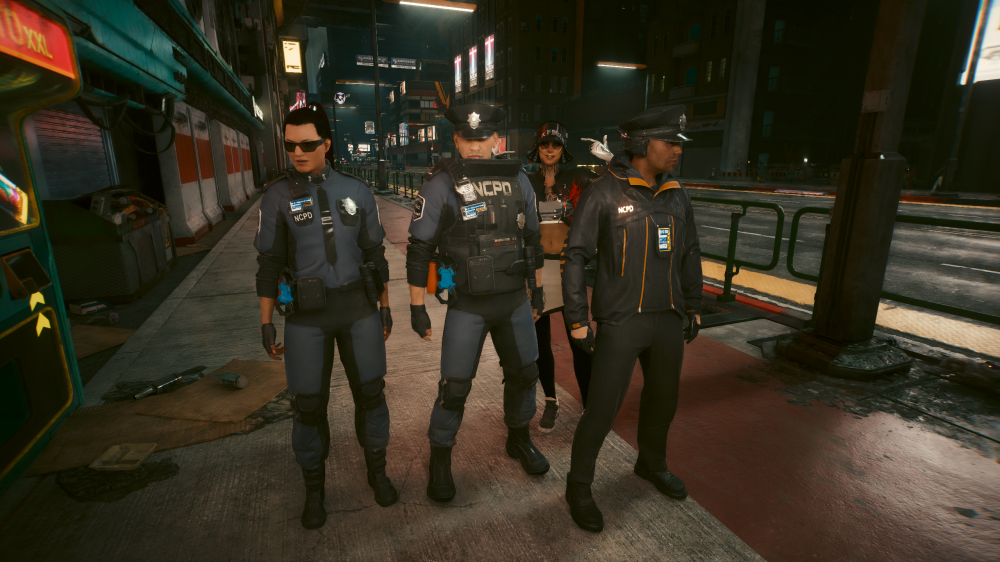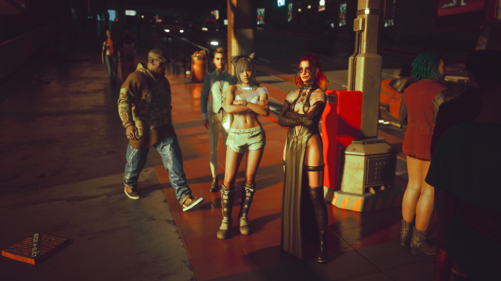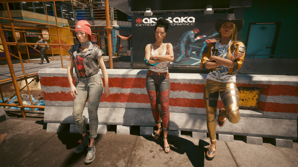 These three I usually only met walking around solo. They were standing there together all businesslike, ready to tackle anything that came at them. Expecting trouble, from the looks of it. Maybe even welcoming it? It is Night City, after all.
