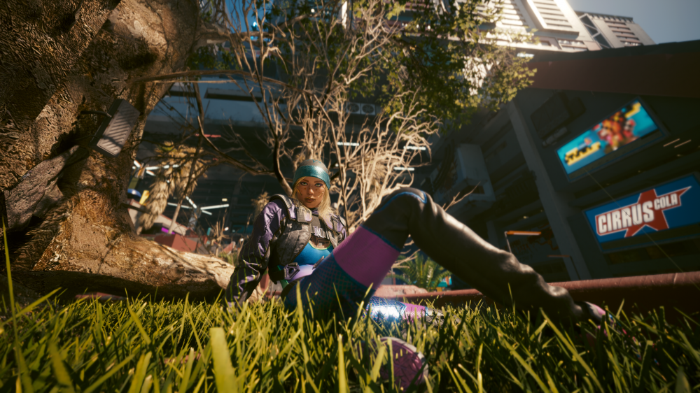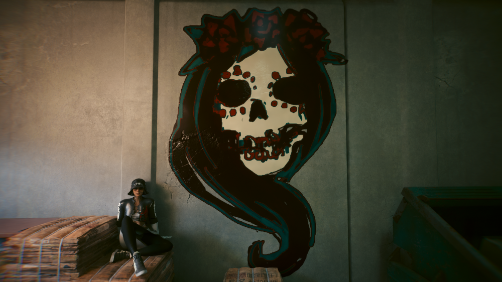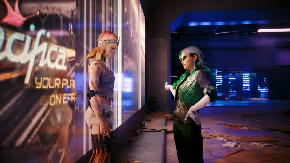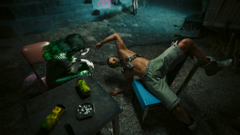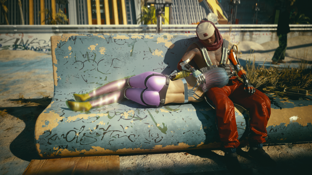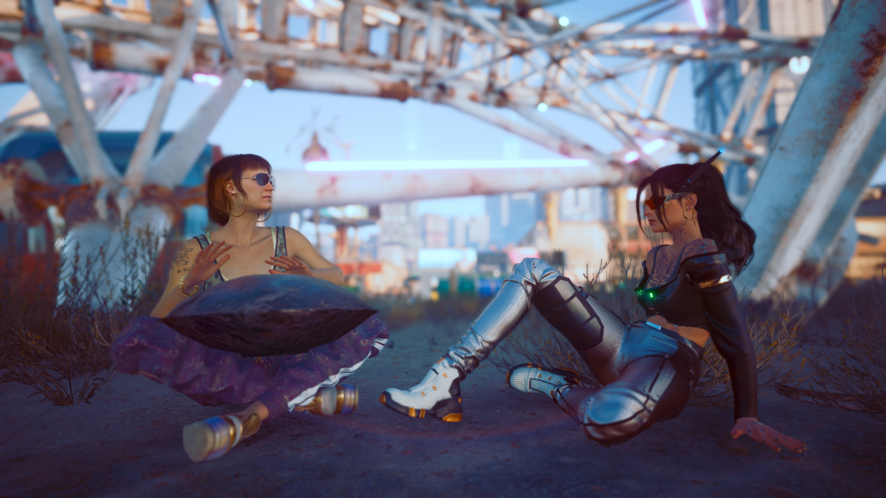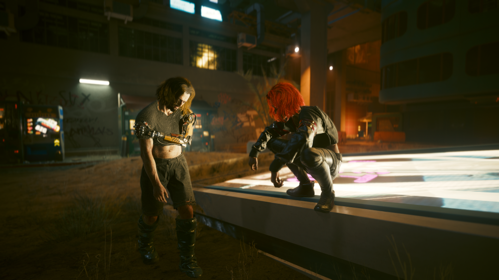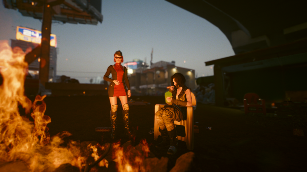 A forgotten suburb of Night City, transformed into a shanty town now housing many of those the city has forsaken. I was perched on this big electronic poster that has toppled over, endlessly trying to play old ads on a broken screen, when a war veteran ambled over. He was in need of some kind words.