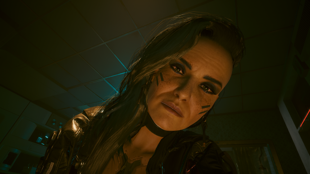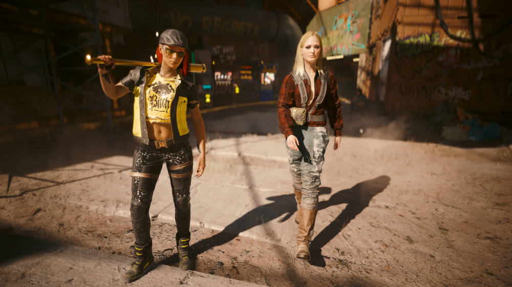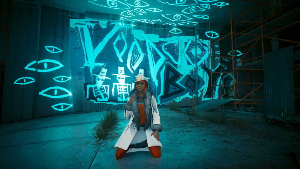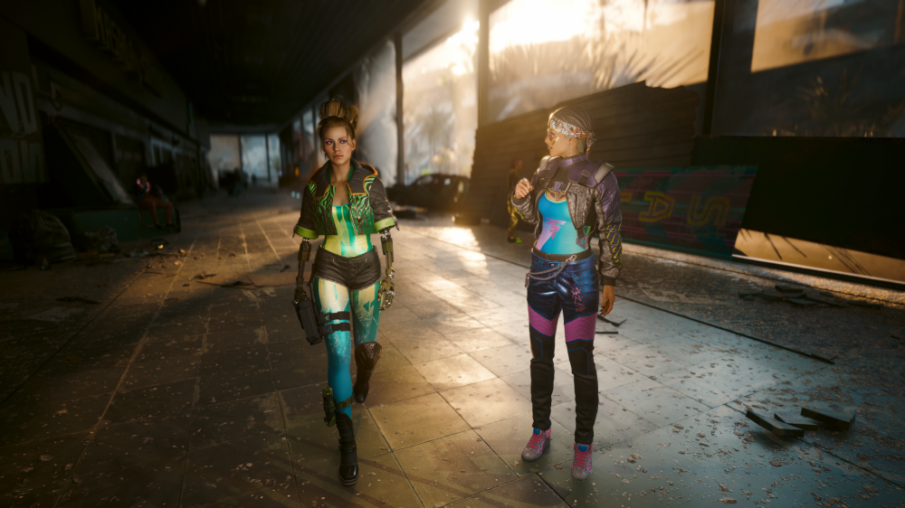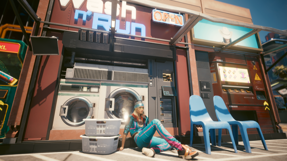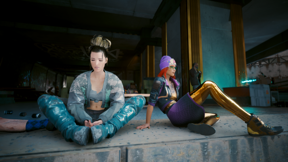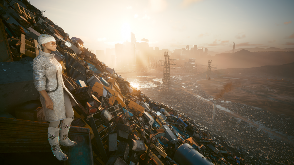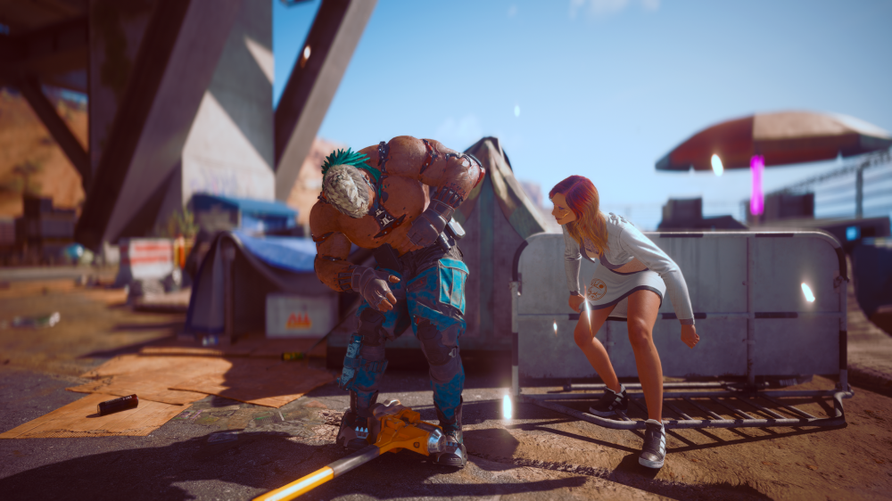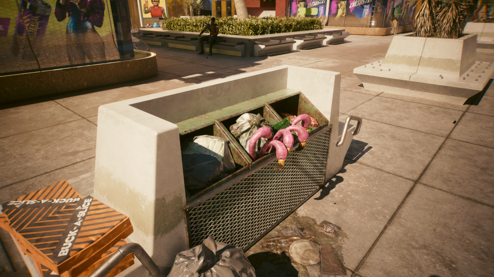 A forgotten suburb of Night City, transformed into a shanty town now housing many of those the city has forsaken. I was perched on this big electronic poster that has toppled over, endlessly trying to play old ads on a broken screen, when a war veteran ambled over. He was in need of some kind words.