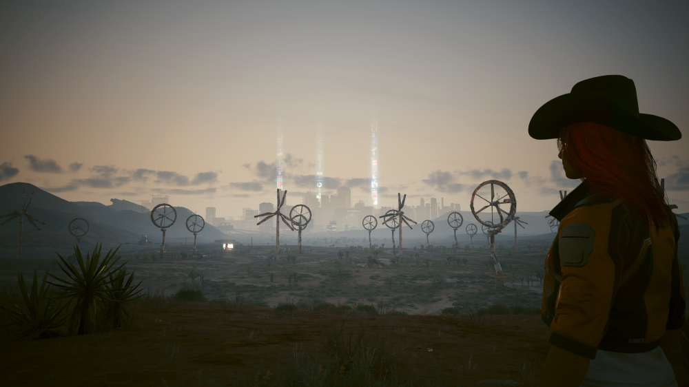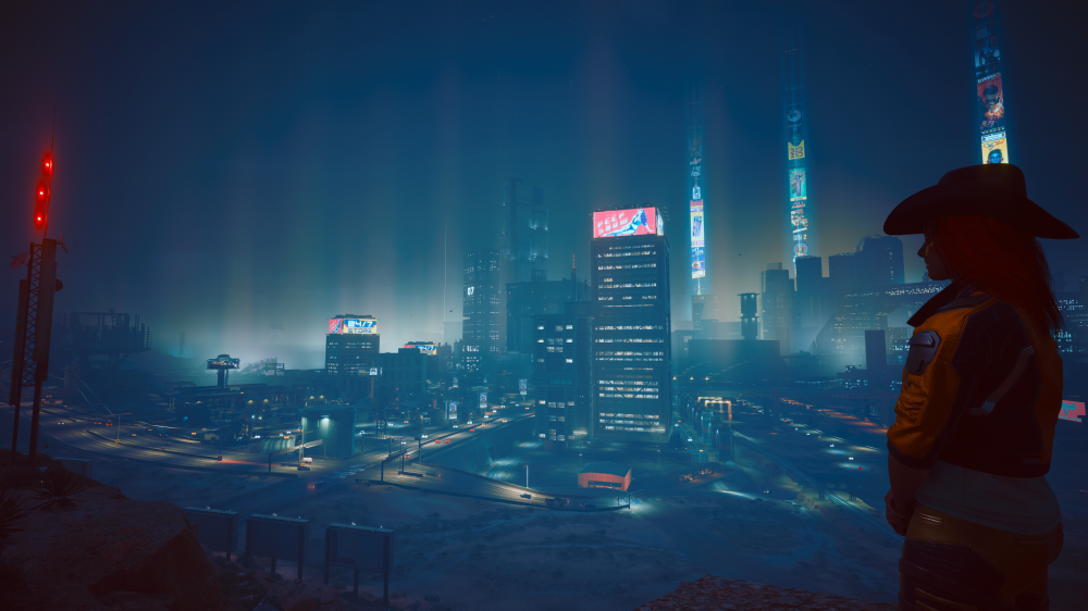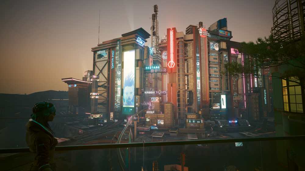 Seen from this hotel room balcony, Night City seems to be just one big block of towers.