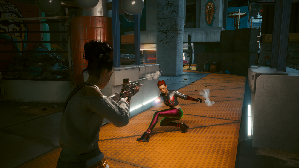 For this shot, I was pausing the game to look at my attacker's facial expressions. I had not realized that you can actually see shell casings fly from the gun while she's shooting.