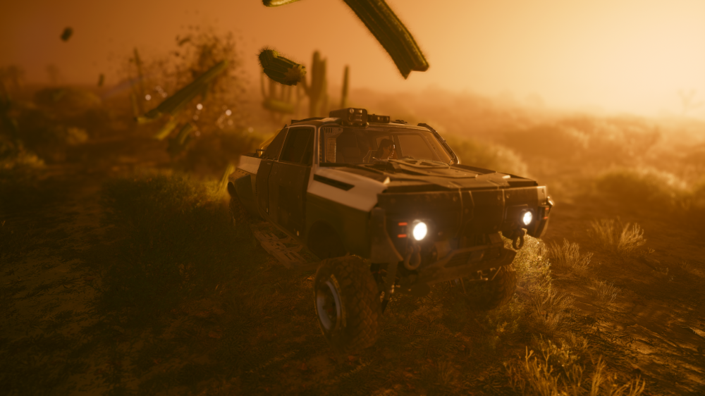 I was in the badlands when a sandstorm happened. In the bad visibility, I had the wild luck to find this beast of a car. The sandstorm lighting was quite special, so I had to jump out for a shot.