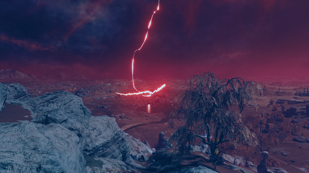 This planet had some really interesting geology, and a conveniently placed mountain from which to survey everything. I think I'll have to buy some more jetpack fuel after this, but it was very much worth it!