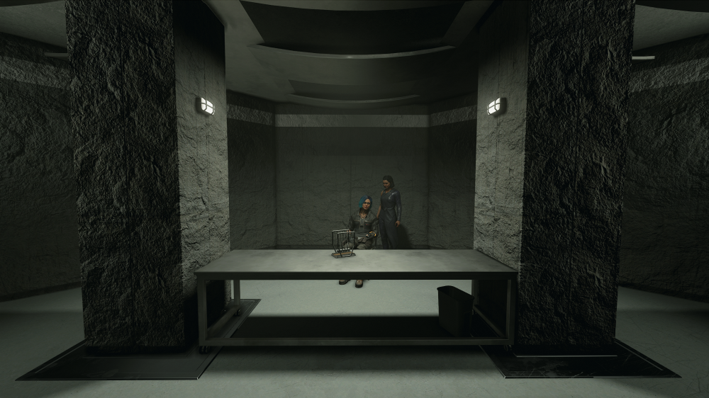 We found this interrogation room in MAST in New Atlantis. One can tell that it's not exactly made to make you feel at ease. Even the Newton's Cradle on the table is anxiety inducing if I imagine the interrogator idly using it during a period of silence.